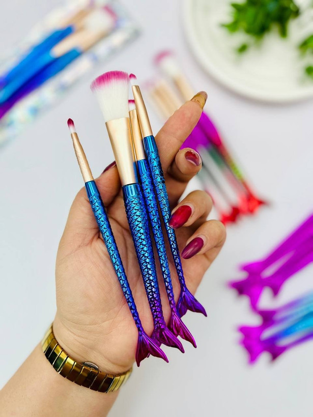 ست براش آرایشی پری دریایی مدل دم ماهی | ۴ عددی برای رژگونه، کانتور، سایه و هایلایتر