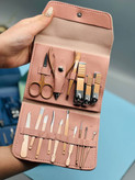 ست مانیکور حرفهای با کیف چرمی شامل ۱۶ ابزار مورد نیاز برای آرایش و مراقبت از ناخنها.