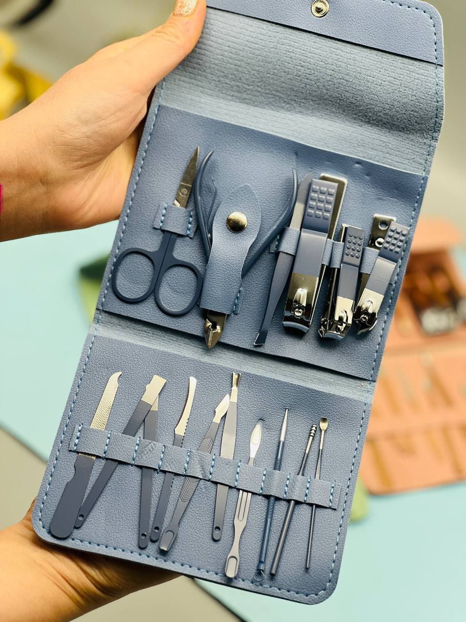 ست مانیکور حرفهای با کیف چرمی شامل ۱۶ ابزار مورد نیاز برای آرایش و مراقبت از ناخنها.